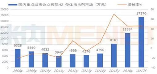 米內(nèi)網(wǎng)數(shù)據(jù)顯示,2016年國內(nèi)重點城市公立醫(yī)院H2受體拮抗劑用藥金額為1.19億元,同比上一年增長率為45.62%。據(jù)2017年1~3季度數(shù)據(jù)估算,2017年國內(nèi)重點城市公立醫(yī)院替丁類藥物市場為1.74億元,同比上一年增長率為46.16%。