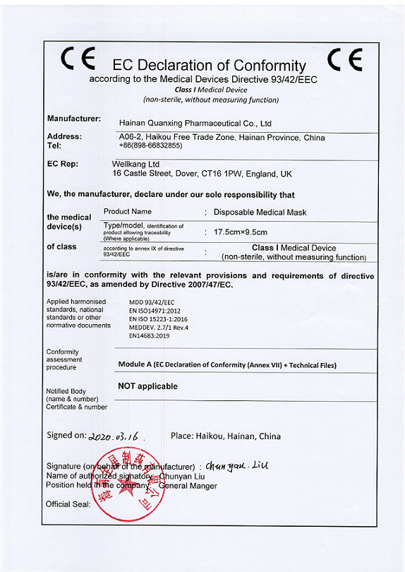 至此我司非無菌醫(yī)用口罩順利通過CE認證,成為海南省首家醫(yī)用口罩產(chǎn)品通過歐盟認證的企業(yè)。